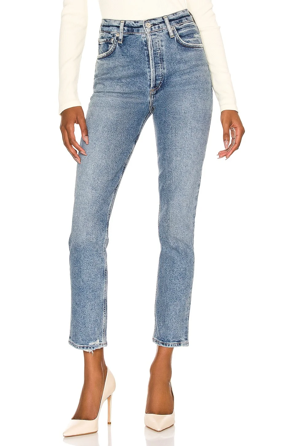 - 98% cotton 2% polyurethane - Made in U - S.A - Machine wash - Button fly.5-pocket styling - Distressed detail at pockets and hem - Light fading.14" at the knee narrows to 12" at the leg opening - Revolve Style No. CITI-WJ1621 - Manufacturer Style No. 1731-3009