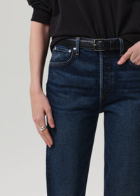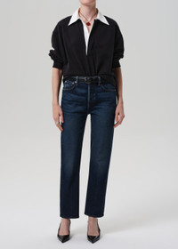 The Blaine is a vintage-inspired straight leg, cut from Japanese comfort stretch denim with a soft, broken-in feel. Designed with a high rise and ankle-grazing length, it offers a structured yet wearable silhouette. The Sutherland wash—a dark indigo with subtle fading and whiskering—adds depth and versatility. Pair with crisp shirting or layered knits for everyday polish. This fit is true to size. Looks Like: Dark indigo denim pant Feels Like: Japanese comfort stretch, archive denim with a super soft hand for all day wearability From our HUMANITY Collection DETAILS Closure: Button Fly Rise: 11 1/2" Inseam: 29" Leg Opening: 15 1/4" Model is 5'10" and wearing a size 27 Fabric Content: 98% Cotton 2% Polyurethane Care Instructions: Machine wash cold inside out with like colors. Do not bleach. Tumble dry low. Made in Turkey with imported materials 2197-3009_SULND