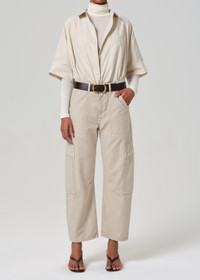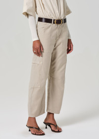 Easy and effortless. Our Marcelle features cargo-inspired detailing and relaxed straight leg that tapers at the ankle. Crafted a breathable but rigid, non-stretch twill for all day wear - style yours back to heels or sneakers. This fit is true to size. Looks Like: Light khaki cargo pant Feels Like: Rigid, non stretch regenerative cotton with a soft hand feel This product is made with regenerative cotton from Citizens of Humanity Group’s Regenerative Cotton Program. Our program collaborates closely with farmers both domestically and internationally, nurturing growth, fostering education, and encouraging the widespread adoption of regenerative agricultural practices. From our HUMANITY Collection DETAILS Closure: Zip Fly Rise: 11 3/4" Inseam: 27" Leg Opening: 17 1/2" Model is 5'10" and is wearing a Size 27 Fabric Content: 100% Regenerative Cotton Care Instructions: Machine wash cold inside out with like colors. Do not bleach. Tumble dry low. Made in Turkey with imported materials 2078-576_BURQU
