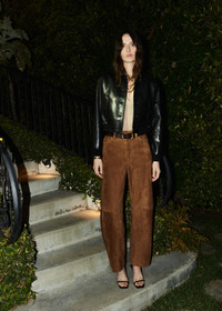 A high-rise relaxed pant crafted from ultra-soft suede with a velvety, polished finish. The silhouette tapers to the ankle, creating a clean, modern line. In a rich toasted caramel, it brings warmth and texture to any ensemble and pairs seamlessly with minimalist tops and sleek footwear for effortless refinement. This fit is true to size. Looks Like: Medium to dark brown suede pant Feels Like: Smooth and ultra-soft suede pant with a velvety finish From our HUMANITY Collection DETAILS Closure: Zip Fly Rise: 11 5/8" Inseam: 27" Leg Opening: 17 1/2" Model is 5'10" and wearing a size 27 Fabric Content: 100% Suede Care Instructions: Dry clean only. Made in Turkey with imported materials 2262_TCARA