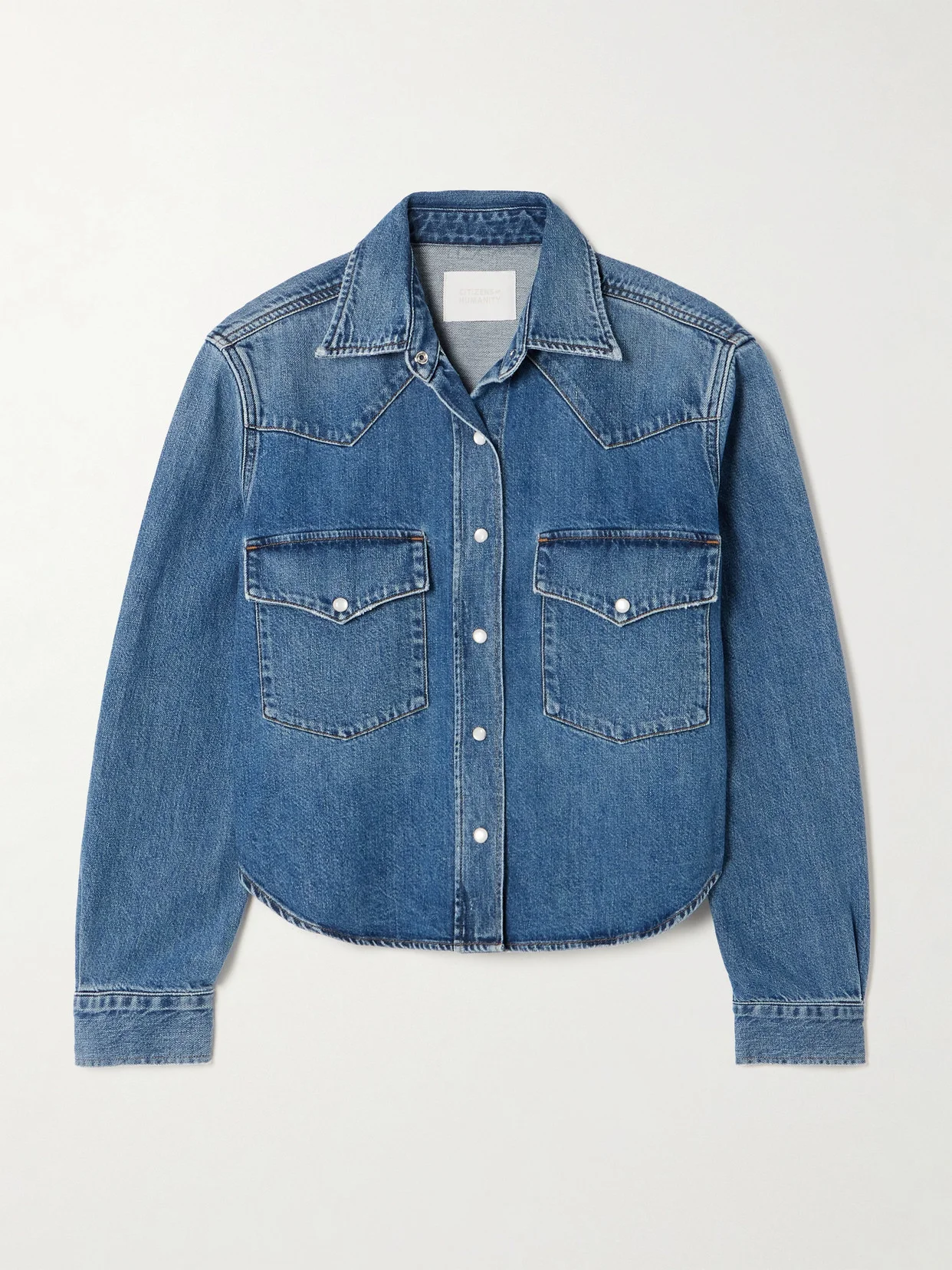 Inspired by Western styles, Citizens of Humanity's shirt is cut from faded bio-based indigo-dyed denim and has pointed seams along the yoke to match the flap pockets. It has a slightly loose, cropped shape and glossy snap fastenings.