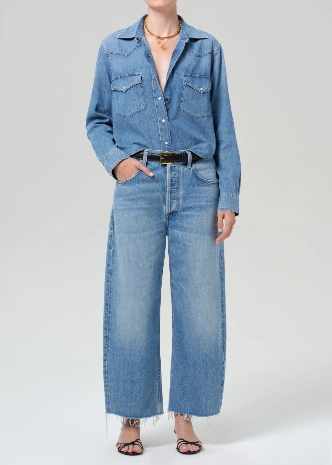 Featuring all the traditional Western style details - two chest pockets, front yoke, and a snap-front closure and crafted in our rigid, but breathable Japanese Denim Shirting, we updated the classic silhouette to have a cropped body, making it the perfect piece to pair back to high waist denim for a whole denim-on-denim look. This fit is true to size. Looks Like: Medium washed indigo with a subtle drape Feels Like: Non-stretch cotton with an authentic vintage hand From our HUMANITY Collection DETAILS Body Length: 22 1/4" Shoulder to Shoulder: 17 3/4" Sleeve Length: 23 3/4" Model is 5'10" and wearing a size Small Fabric: 100% Cotton Care Instructions: Machine wash cold inside out with like colors. Do not bleach. Tumble dry low. Made in Turkey with imported materials 9326B-1527_CARBL