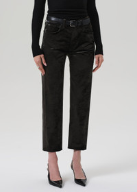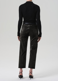 The ‘Delfina’ is a high-rise straight leg crafted from ultra-soft stretch velvet with a smooth, polished finish. Designed to flatter while offering ease, it brings a refined texture to everyday wear. The Olive Leaf hue—a rich, dark green—adds depth and versatility, ideal styled with crisp shirting or tonal knits. This fit is true to size. Looks Like: Dark olive green velvet pant Feels Like: Ultra soft stretch velvet with a refined, smooth polished texture From our HUMANITY Collection DETAILS Closure: Zip Fly Rise: 11 1/2" Inseam: 27 1/2" Leg Opening: 15 3/4" Model is 5'10" and wearing a size 27 Fabric Content: 54% Cotton 44% Rayon 2% Spandex Care Instructions: Machine wash cold inside out with like colors. Do not bleach. Tumble dry low. Made in Turkey with imported materials 2250-1184_OLVLF