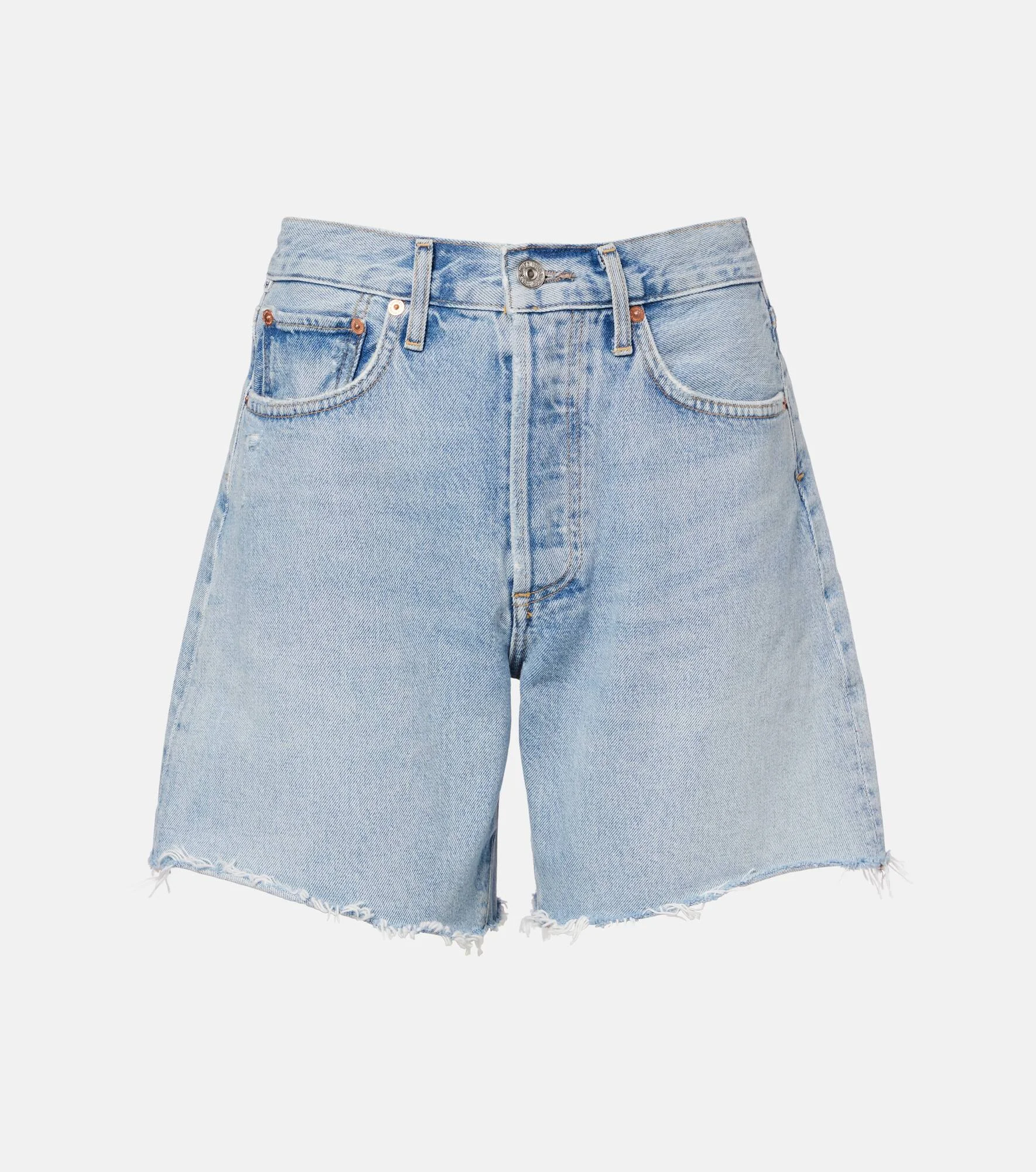 Founded in 2003, Los Angeles label Citizens of Humanity has become synonymous with quality denim. These Burmuda shorts have a light wash and raw hems. Product Details - Material: 100% cotton - Care instructions: machine wash cold - Made in Turkey - Color: blue - Designer color name: Theatre - Closure: concealed button placket - Pockets: five pockets - Belt loops - Item number: P01143126 Size & Fit - True to size - Non-stretchy fabric - Straight leg - Mid-rise - The model seen in the picture is 178cm-5'10" and wearing a size 26