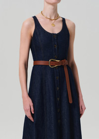 Timeless denim redefined with purpose. The Farrow Dress from the Citizens of Humanity x Argent Good Work collection is a classic button-front design, crafted from a blend of 80% regenerative cotton and 20% post-consumer recycled cotton. With its cinched waist and flattering silhouette, this dress exudes effortless style while maintaining a sharp, structured fit. Perfect for layering or wearing on its own, it combines the versatility of denim with a sustainable edge, making it a seasonless wardrobe essential. This fit is true to size. The Citizens of Humanity x Argent collection unites two brands driven by a shared commitment to responsible design, sustainability, and empowering women. Crafted for a modern wardrobe that transitions seamlessly from work to life, the collection features elevated, versatile pieces made with sustainable materials such as regenerative cotton and bio indigo dye. More than clothing, this collaboration is a call to action—championing values that matter and inspiring women to advocate for a more sustainable future. This product is made with regenerative cotton from Citizens of Humanity Group’s Regenerative Cotton Program. Our program collaborates closely with farmers both domestically and internationally, nurturing growth, fostering education, and encouraging the widespread adoption of regenerative agricultural practices. DETAILS Measurements: Chest: 34" Body Length: 51 1/2" Fabric: Shell: 100% Regenerative cotton Care Instructions: Machine wash cold with like colors, inside out, do not bleach, tumble dry low, iron medium if necessary, if decorated or printed do not iron. Made in USA with imported materials 450-1812_OMNI