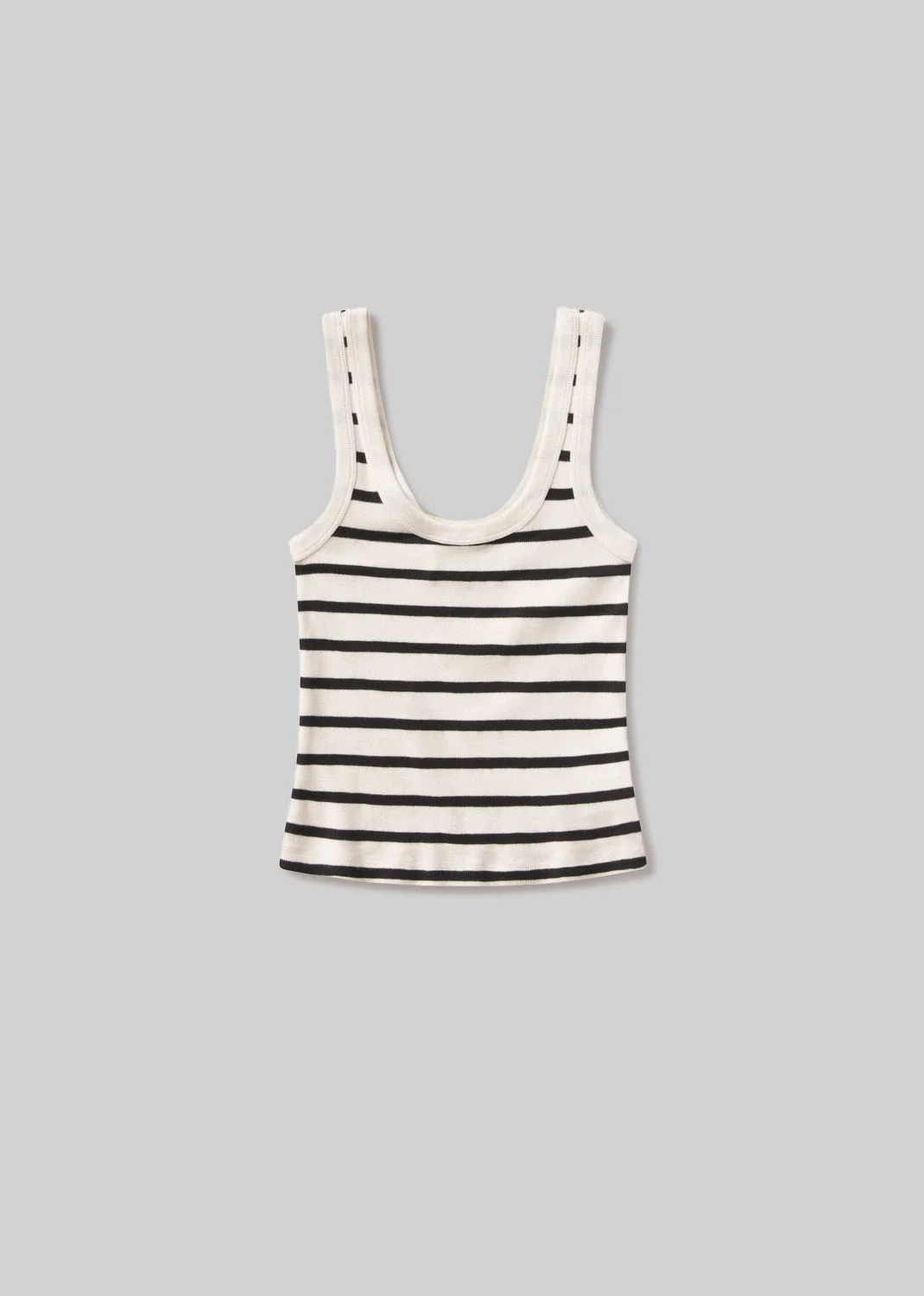 The Faye Tank is a foundational wardrobe piece, crafted from soft, breathable organic cotton for effortless wear. Featuring a slightly cropped fit and a flattering U neckline, its minimalist design makes it the perfect pairing for everything from high-rise jeans to skirts, seamlessly transitioning from day to night with ease. This fit is true to size. Looks Like: Navy and white striped scoop neck sleeveless tank top Feels Like: Ultra lightweight rib cotton blend meant to hold its shape all day long From our HUMANITY Collection DETAILS Body Length: 19 1/2" Chest: 26 1/2" Model is 5'10" and wearing a size Small Fabric Content: 80% Cotton 20% Polyester Care Instructions: Machine wash cold Made in USA with imported materials 9390-1823_MSTR