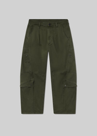 Vintage-inspired utility fit with a pleated waist and barrel leg silhouette. This fit is true to size. Looks Like: Dark olive green cargo pant with pleat detailing and side pockets Feels Like: Midweight yet breathable stretch twill with a soft hand that gives a vintage feel From our HUMANITY Collection DETAILS Closure: Zip Fly Rise: 12 1/4" Inseam: 29" Leg Opening: 19" Model is 5'10" and is wearing a Size 27 Fabric Content: 97% Organic Cotton 3% Elastane Care Instructions: Machine wash cold inside out with like colors. Do not bleach. Tumble dry low. Made in USA with imported materials 2189-1355_DGWOD