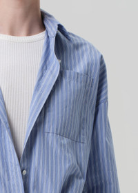 The ‘Frances’ is a fresh take on the classic button-up, crafted from ultra-lightweight cotton poplin with an airy, breathable feel. Designed with a cropped silhouette and subtle cape-inspired back detail, it blends structure with softness. Style it with high-rise denim or tailored shorts for a modern, effortless look. This fit is true to size. Looks Like: Medium and light blue striped cropped short sleeve button up shirt Feels Like: Ultra lightweight Japanese cotton with an airy hand From our HUMANITY Collection DETAILS Body Length: 22 3/4" Chest: 45 1/2" Sleeve Length: 9 1/2" Model is 5'10" and wearing a size Small Fabric Content: 100% Cotton Care Instructions: Machine wash cold inside out with like colors. Do not bleach. Tumble dry low. Made in Turkey with imported materials 9439-1887_KSTRP