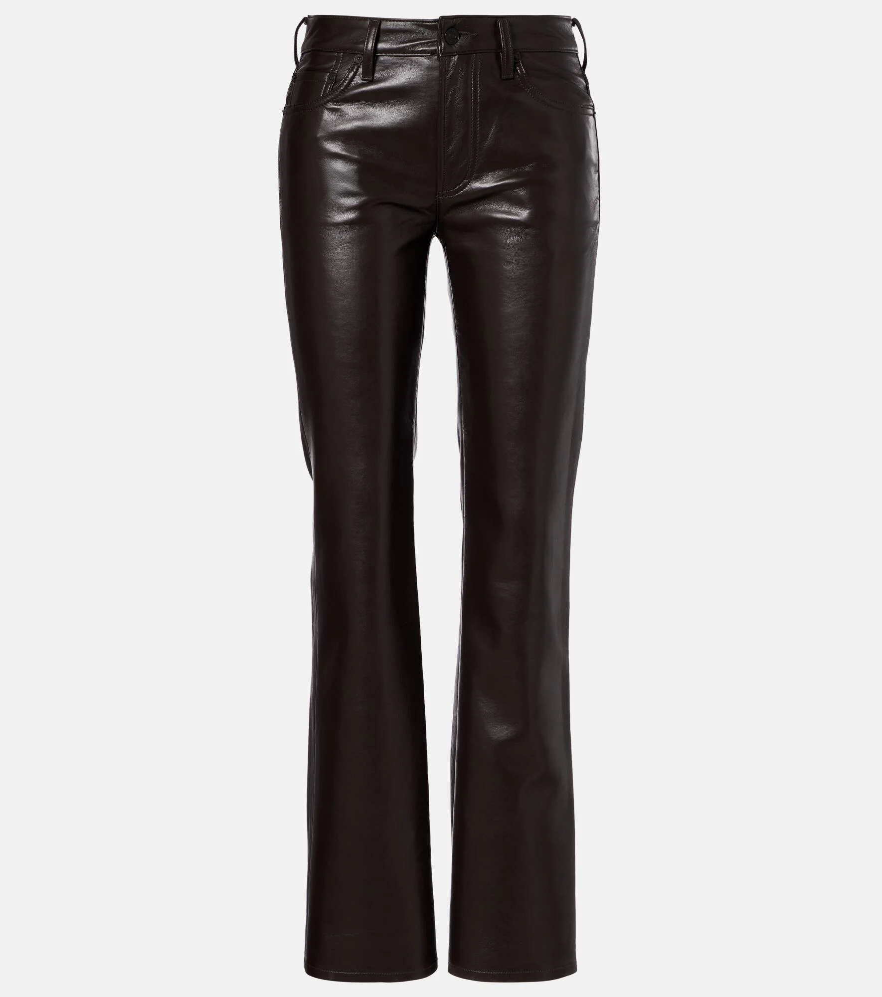 Founded in 2003, Los Angeles label Citizens of Humanity has become synonymous with quality designs. Partly made from recycled leather, the Genova pants feature a bootcut silhouette with a low-rise waist. Product Details - Material: 50% leather (recycled), 30% polyurethane, 10% viscose, 10% polyester - Care instructions: specialist clean - Made in Turkey - Designer color name: Chocolate - Item color: brown - Closure: zipper fly, button fastening - Pockets: five pockets - Belt loops - Item number: P01115518 Size & Fit - Fits small to size - we recommend trying one size larger - Non-stretchy fabric - Bootcut - The model seen in the picture is 178cm-5'10" and wearing a size 27