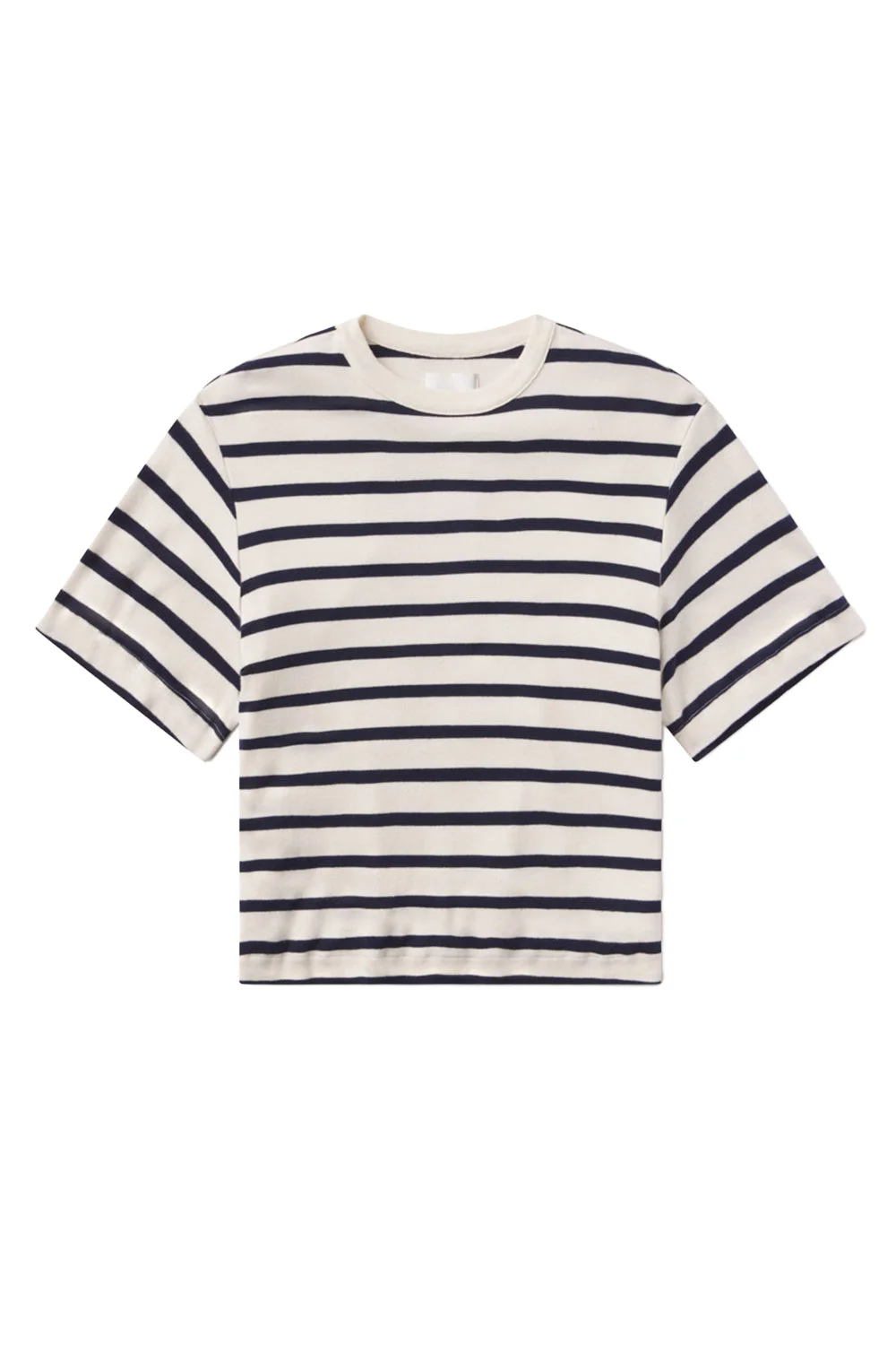 DETAILS AND INSIGHT Citizens Of Humanity goldie stripe tee in azure. 90% Cotton 10% Polyester Machine Wash Cold Inside Out With Like Colors. Do Not Bleach. Tumble Dry Low. Made In Usa Style 9345-1822-AZURE