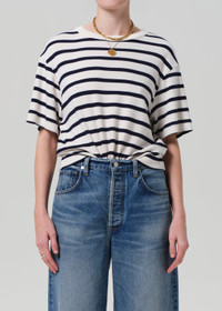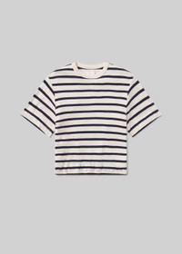 With a slight oversized fit, elbow length sleeves, the Goldie Tee is no-brainer. A casual but simple, the year-round staple you've been looking for. This fit is true to size. Looks Like: Cream and navy striped short sleeve tee Feels Like: Ultra lightweight rib cotton blend meant to hold its shape all day long From our HUMANITY Collection DETAILS Body Length: 24" Chest: 39 1/2" Sleeve Length: 8 1/4" Model is 5'10" and wearing a size Small Fabric Content: 90% Cotton 10% Polyester Care Instructions: Machine wash cold inside out with like colors. Do not bleach. Tumble dry low. Made in USA with imported materials 9345-1822_AZRST