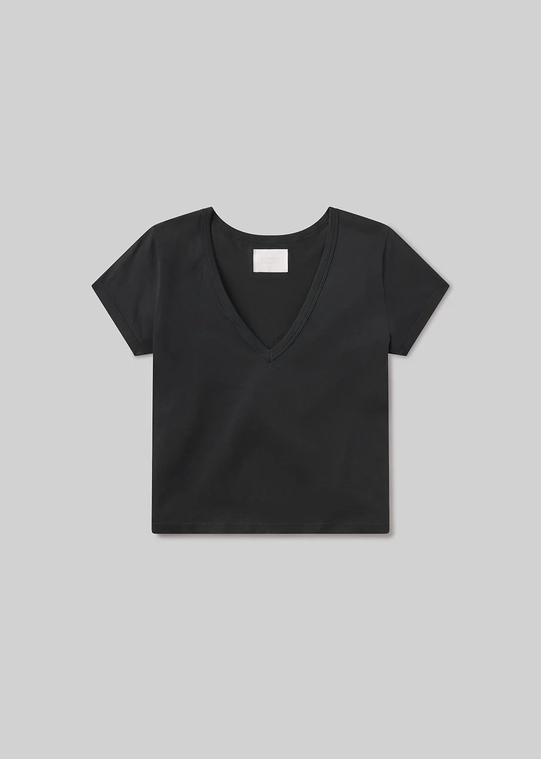 The Hara Tee is an elevated essential, crafted from lightweight, breathable Supima cotton with an exceptionally soft hand. Designed with a clean V-neckline and short sleeves, it offers a timeless fit that layers effortlessly or stands alone with ease. This fit is true to size. Looks Like: Washed black short sleeve v-neck tee Feels Like: Lightweight, breathable soft supima cotton From our HUMANITY Collection DETAILS Body Length: 21 3/4" Chest: 36 1/2" Sleeve Length: 5" Model is 5'10" and is wearing a size Small Fabric Content: 100% Supima cotton Care Instructions: Machine wash cold inside out with like colors. Do not bleach. Tumble dry low. Made in USA with imported materials 9471-1211_WBLK