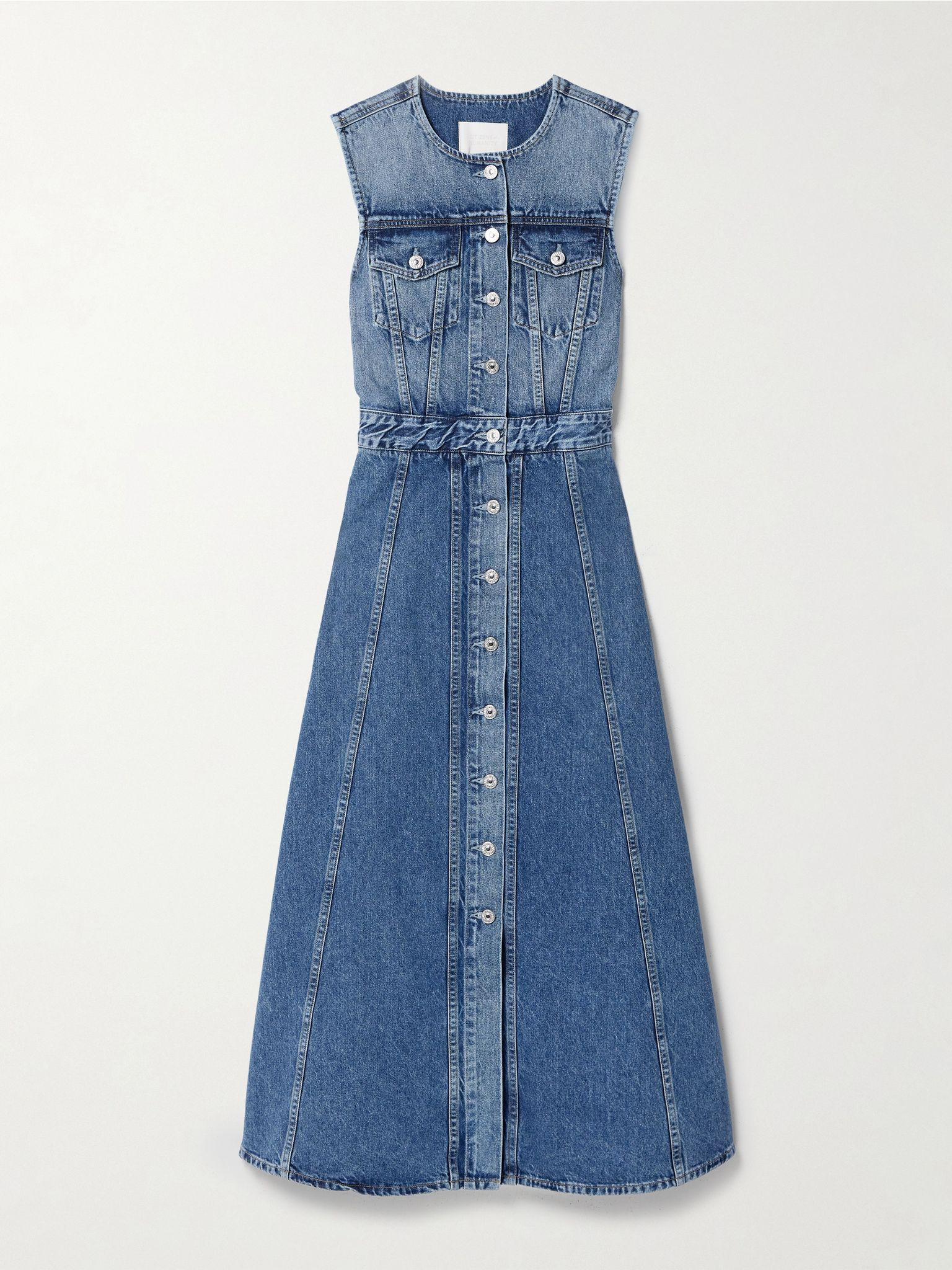 Citizens of Humanity's 'Idalene' shirt dress is part of the 'Humanity' capsule, which is filled with pieces made from globally sourced textiles. It's cut from rigid denim that's comprised of both organic and recycled fibers and has a nipped-in waist. The intentional fading gives it a truly vintage feel. Lower-Impact Materials. This product is made using at least 50% lower-impact materials or ingredients. Find out more about our NET SUSTAIN criteria here. Size & Fit - Fits true to size, take your normal size - Intended to be slightly fitted at the bust and waist, loose at the hip - Mid-weight, non-stretchy denim - Model is 180cm/ 5'11" and is wearing a size Small Details & Care - Blue denim - Button fastenings through front - 80% organic cotton, 20% recycled cotton - Machine wash - Designer wash: Terrace