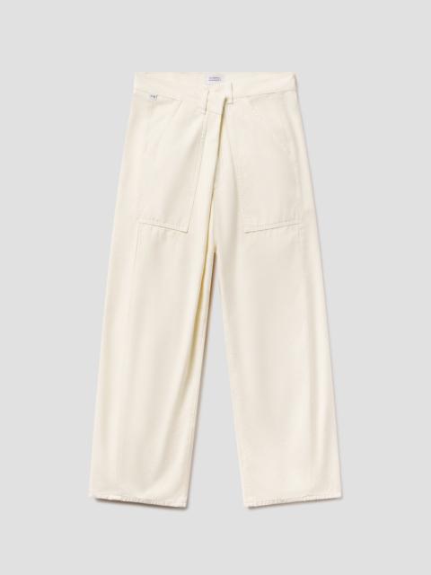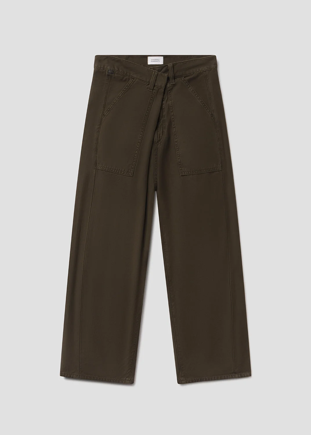 The Ines is a high-rise cropped trouser with a structured silhouette and subtle utilitarian edge. Crafted from rigid regenerative cotton twill, it’s designed to hold its shape while offering all-day comfort. Finished with a folded front closure and utility-inspired pockets, it’s an effortless staple—ideal with slim knits, crisp shirting, or oversized layers. This fit is true to size. Looks Like: Dark green trouser with fold front closure and utility pockets Feels Like: Rigid, non-stretch twill made to hold its shape all day long This product is made with regenerative cotton from Citizens of Humanity Group’s Regenerative Cotton Program. Our program collaborates closely with farmers both domestically and internationally, nurturing growth, fostering education, and encouraging the widespread adoption of regenerative agricultural practices. From our HUMANITY Collection DETAILS Closure: Zip Fly Rise: 12 1/4" Inseam: 30 1/2" Leg Opening: 21" Model is 5'10" and is wearing a Size 27 Fabric Content: 100% Regenerative Cotton Care Instructions: Machine wash cold inside out with like colors. Do not bleach. Tumble dry low. Made in Turkey with imported materials 2234-576_MO
