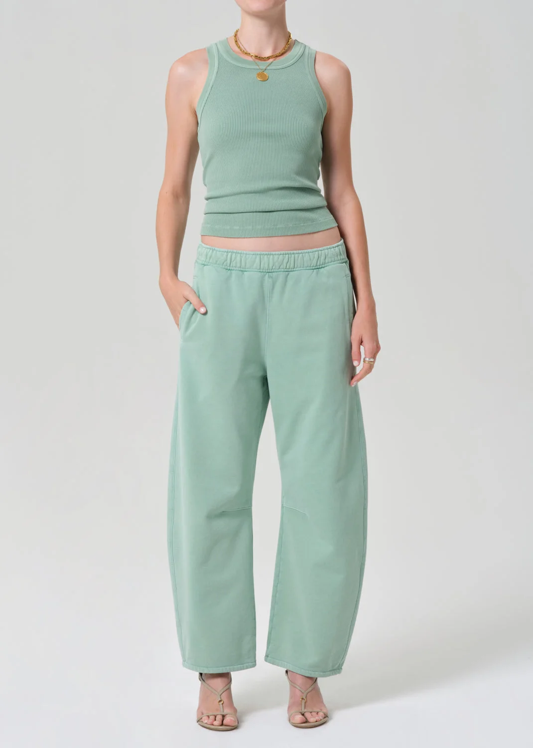 The Isabel Tank is a modern essential, cut in ultra-soft, supportive ribbed cotton with a close, flattering fit. Designed with a high neckline and clean finish, it’s ideal worn solo or layered under structured pieces. A polished base for elevated everyday styling. This fit is true to size. Looks Like: Light to medium green ribbed tank Feels Like: Ultra soft and supportive ribbed cotton From our HUMANITY Collection DETAILS Body Length: 21 3/4" Chest: 24 1/2" Model is 5'10" and wearing a size Small Fabric Content: 49% Tencel Lyocell 49% Organic Cotton 2% Spandex Care Instructions: Machine wash cold inside out with like colors. Do not bleach. Tumble dry low. Made in USA with imported materials 9201-3004_CADET
