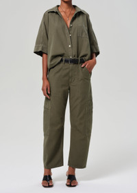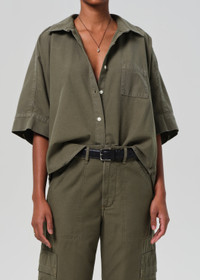 The Claire Origami Shirt has a loose fit, oversized sleeves and a classic pointed collar. This fit is true to size. Looks Like: Dark olive green short sleeve button up shirt Feels Like: Midweight rigid, non-stretch twill made with regenerative cotton This product is made with regenerative cotton from Citizens of Humanity Group’s Regenerative Cotton Program. Our program collaborates closely with farmers both domestically and internationally, nurturing growth, fostering education, and encouraging the widespread adoption of regenerative agricultural practices. From our HUMANITY Collection DETAILS Body Length: 26 1/2" Chest: 55 1/2" Sleeve Length: 18 3/4" Model is 5'10" and wearing a size Small Fabric Content: 100% Regenerative Cotton Care Instructions: Machine wash cold inside out with like colors. Do not bleach. Tumble dry low. Made in USA with imported materials 9395-576_DGWOD
