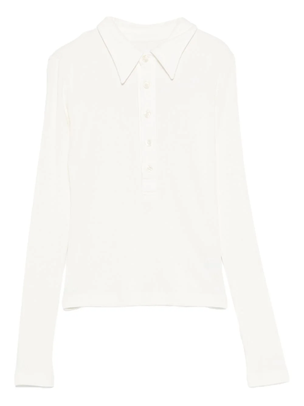 long-sleeve polo top Highlights - White - Front button fastening - Long sleeves - Point collar - Ribbed knit Made in United States Composition Organic Cotton 49%, Lyocell 49%, Spandex/Elastane 2% SIZE & FIT Model measurements Height 5 ft 10 in(1.78 m) Bust/Chest 31.49 in(80 cm) Hips 37 in(94 cm) Waist 23.62 in(60 cm) Washing instructions Hand Wash