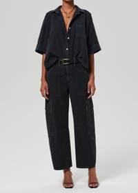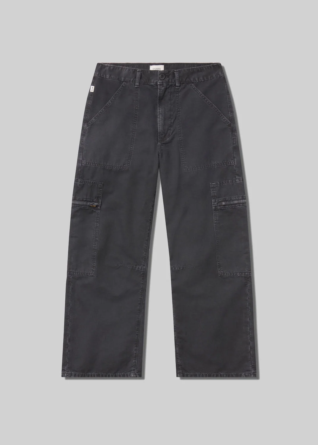 Easy and effortless. Our Marcelle features cargo-inspired detailing and relaxed straight leg that tapers at the ankle. Crafted a breathable but rigid, non-stretch twill for all day wear - style yours back to heels or sneakers. This fit is true to size. Looks Like: Cool, stark black Feels Like: Midweight yet breathable rigid twill with a soft hand that gives a vintage feel. This product is made with regenerative cotton from Citizens of Humanity Group’s Regenerative Cotton Program. Our program collaborates closely with farmers both domestically and internationally, nurturing growth, fostering education, and encouraging the widespread adoption of regenerative agricultural practices. From our HUMANITY Collection DETAILS Closure: Zip Fly Rise: 11 3/4" Inseam: 27" Leg Opening: 17 1/2" Model is 5'10" and is wearing a Size 27 Fabric Content: 100% Regenerative Cotton Care Instructions: Machine wash cold inside out with like colors. Do not bleach. Tumble dry low. Made in Turkey with imported materials 2078-576_WBLK