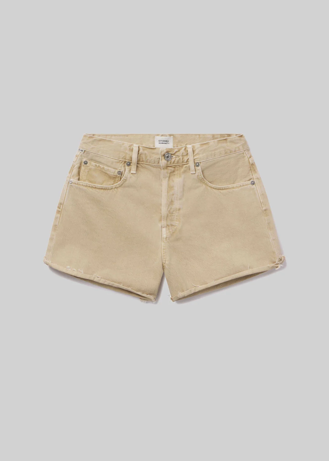 A true summer staple, this relaxed mid-rise offers an easy fit with undone edges. Perfect for a getaway, these ultra-comfortable cut-offs can be styled with virtually anything. We like to pair ours with a classic tee or light sweater. This fit is true to size. Looks Like: Medium beige short with raw hem Feels Like: Rigid, non-stretch denim with an authentic feel From our HUMANITY Collection DETAILS Closure: Button Fly Rise: 12" Inseam: 3 1/4" Leg Opening: 24 1/2" Model is 5'10 and wearing a size 27 Fabric Content: 100% Cotton Care Instructions: Machine wash cold inside out with like colors. Do not bleach. Tumble dry low. Made in USA with imported materials 996D-1248_HMPSD