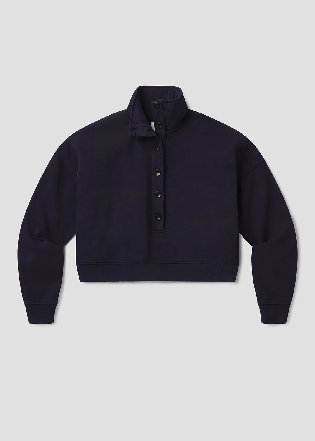 The ‘Mirelle’ is a modern update to the classic sweatshirt, crafted from soft brushed fleece with a plush, cozy feel. Designed with a high funnel neckline and button closure, the relaxed silhouette offers warmth and polish in equal measure. Ideal for off-duty layering or elevated lounging. This fit is true to size. Looks Like: True navy funnel neck sweatshirt with button closure Feels Like: Soft brushed fleece with a cozy plush feel From our HUMANITY Collection DETAILS Body Length: 21 1/4" Chest: 49" Sleeve Length: 22 1/4" Model is 5'10" and wearing a size Small Fabric Content: 100% Cotton Care Instructions: Machine wash cold inside out with like colors. Do not bleach. Tumble dry low. Made in USA with imported materials 9415-3057_NVY