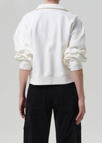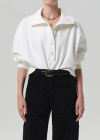 The ‘Mirelle’ is a modern update to the classic sweatshirt, crafted from soft brushed fleece with a plush, cozy feel. Designed with a high funnel neckline and button closure, the relaxed silhouette offers warmth and polish in equal measure. Ideal for off-duty layering or elevated lounging. This fit is true to size. Looks Like: Off white funnel neck sweatshirt with button closure Feels Like: Soft brushed fleece with a cozy plush feel From our HUMANITY Collection DETAILS Body Length: 21 1/4" Chest: 49" Sleeve Length: 22 1/4" Model is 5'10" and wearing a size Small Fabric Content: 100% Cotton Care Instructions: Machine wash cold inside out with like colors. Do not bleach. Tumble dry low. Made in USA with imported materials 9415-3057_PMINA