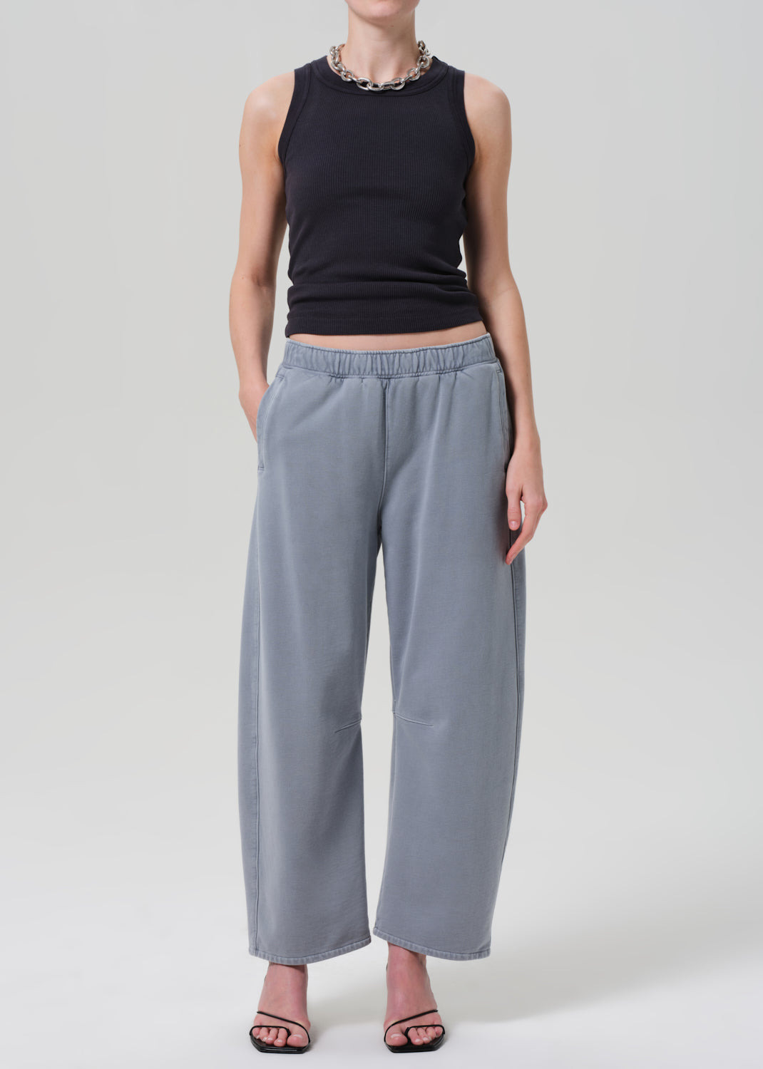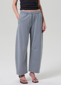 The Miro sweatpant is a relaxed staple with an easy top block and a tapered barrel leg silhouette. This fit is true to size. Looks Like: Light blue fleece sweatpant with grey tones Feels Like: Breathable soft cotton fleece with just the right amount of stretch From our HUMANITY Collection DETAILS Rise: 12 1/2" Inseam: 27" Leg Opening: 19" Model is 5'10" and wearing a size 27 Fabric Content: 100% Cotton Care Instructions: Machine wash cold inside out with like colors. Do not bleach. Tumble dry low. Made in USA with imported materials 9416B-3057_HEMA