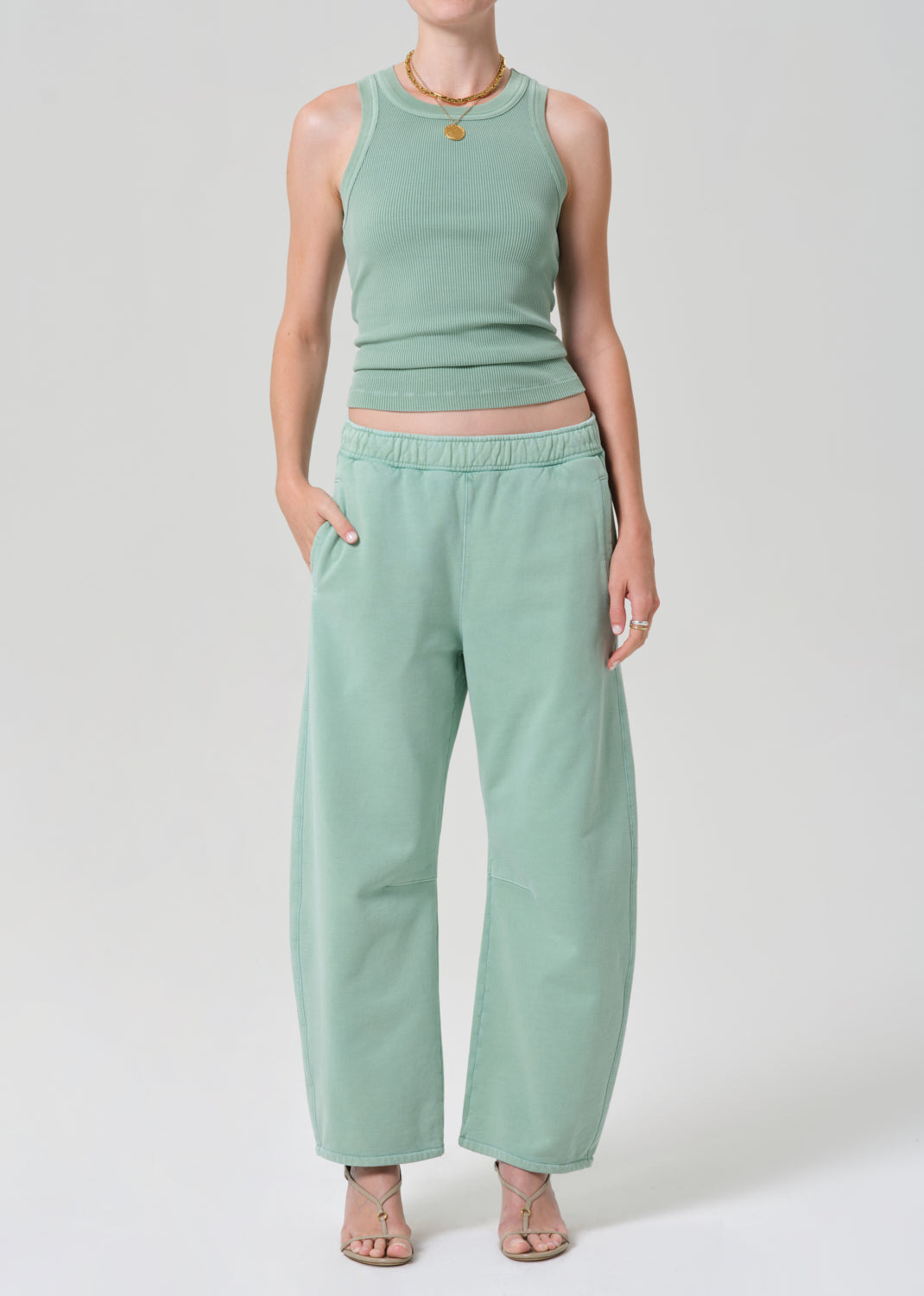 The Miro Sweatpant is crafted from soft brushed fleece with a cozy, plush feel. The light green silhouette features a relaxed, tapered fit with a drawstring waist and ankle-length finish. Perfect for lounging or styled with matching sweat tops for a coordinated, casual look. This fit is true to size. Looks Like: Light to medium green sweatpant Feels Like: Soft brushed fleece with a cozy plush feel From our HUMANITY Collection DETAILS Rise: 12 1/2" Inseam: 27" Leg Opening: 19" Model is 5'10" and wearing a size Small Fabric Content: 100% Cotton Care Instructions: Machine wash cold inside out with like colors. Do not bleach. Tumble dry low. Made in USA with imported materials 9416-3057_CADET