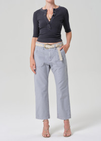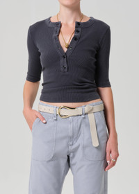 The Nali Short Sleeve Henley is a refined essential crafted from ultra-soft, supportive rib made with regenerative cotton. Designed with a clean neckline and tonal button detailing, it fits close to the body with natural stretch for ease and comfort. A modern classic—effortless on its own or layered for understated polish. This fit is true to size. Looks Like: Dark charcoal grey mineral dyed short sleeve henley Feels Like: Ultra soft and supportive ribbed cotton This product is made with regenerative cotton from Citizens of Humanity Group’s Regenerative Cotton Program. Our program collaborates closely with farmers both domestically and internationally, nurturing growth, fostering education, and encouraging the widespread adoption of regenerative agricultural practices. From our HUMANITY Collection DETAILS Body Length: 21 1/2" Chest: 28" Sleeve Length: 11 3/4" Model is 5'10" and is wearing a size Small Fabric Content: 49% Regenerative Cotton 49% Lyocell 2% Spandex Care Instructions: Machine wash cold inside out with like colors. Do not bleach. Tumble dry low. Made in USA with imported materials 9417B-3004_CHMIN