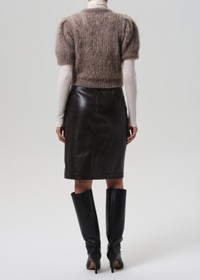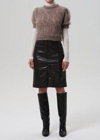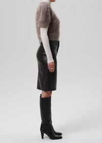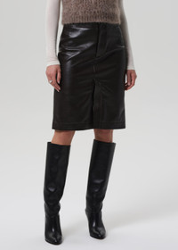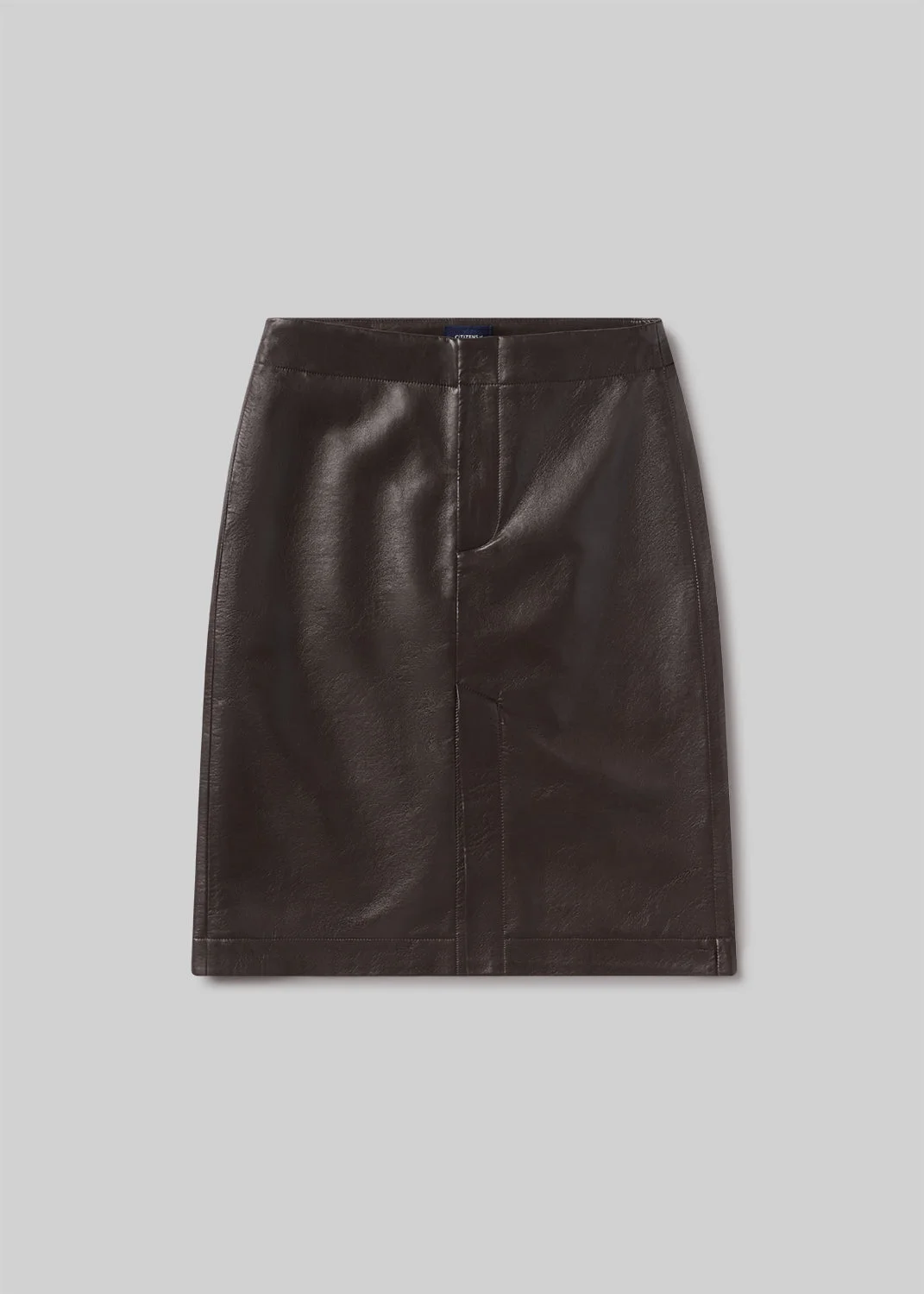 The Nara is a sleek pencil skirt cut from buttery recycled leather with a hint of stretch for ease. In rich Chocolate brown, the silhouette is clean and elongating, finished with a subtle slit for movement and edge. A timeless staple that pairs effortlessly with crisp shirting or the matching leather top for a streamlined set. This fit is true to size. Looks Like: Luxurious chocolate brown leather pencil skirt with slit Feels Like: Buttery, genuine recycled leather with slight stretch for ease From our HUMANITY Collection DETAILS Closure: Button Fly Sweep: 39 1/2" Model is 5'10" and wearing a size 27 Fabric Content: 50% Recycled Leather 30% Polyurethane 10% Viscose 10% Polyester Care Instructions: Machine wash cold inside out with like colors. Do not bleach. Tumble dry low. Made in USA with imported materials 3197-3013_CHO