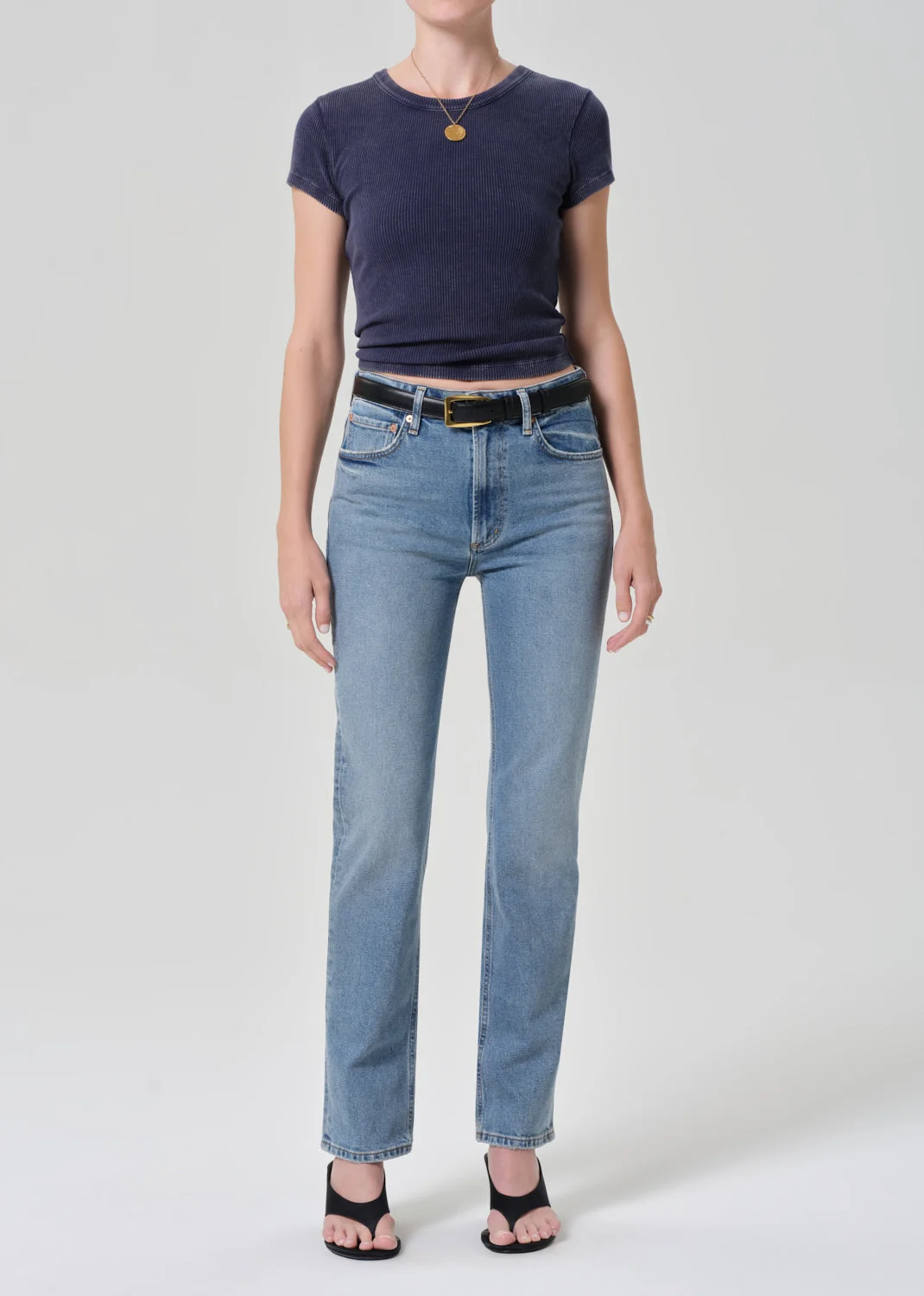 The ‘Nello’ Tee is a refined essential, crafted from a super soft sweater rib with just the right amount of stretch. Featuring a crew neckline and short sleeves, it offers a close fit that’s perfect for layering or wearing on its own. This fit is true to size. Looks Like: Dark navy mineral dyed short sleeve ribbed tee Feels Like: Ultra soft and supportive ribbed cotton This product is made with regenerative cotton from Citizens of Humanity Group’s Regenerative Cotton Program. Our program collaborates closely with farmers both domestically and internationally, nurturing growth, fostering education, and encouraging the widespread adoption of regenerative agricultural practices. From our HUMANITY Collection DETAILS Body Length: 20" Chest: 25 1/2" Sleeve Length: 4 1/2" Model is 5'10" and is wearing a size Small Fabric Content: 49% Regenerative Cotton 49% Tencel Lyocell 2% Spandex Care Instructions: Machine wash cold inside out with like colors. Do not bleach. Tumble dry low. Made in USA with imported materials 9385C-3004_MNRNV