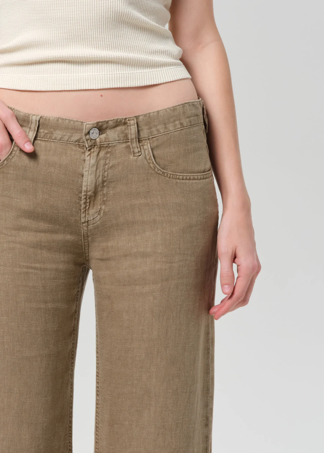 The Nora Trouser Leg is defined by its fluid, elongated shape and relaxed yet tailored fit. Designed in dark khaki, it offers a refined, versatile look. Crafted from cool, crisp, breathable lightweight linen, it delivers effortless drape and all-day comfort—bringing understated sophistication to everyday wear. This fit is true to size. Looks Like: Dark khaki linen pant Feels Like: Cool and crisp breathable lightweight linen From our HUMANITY Collection DETAILS Closure: Zip Fly Rise: 10" Inseam: 31 1/2" Leg Opening: 23 1/4" Model is 5'10" and wearing a size 27 Fabric Content: 100% Linen Care Instructions: Machine wash cold inside out with like colors. Do not bleach. Tumble dry low. Made in USA with imported materials 2284-1777_RSVOI