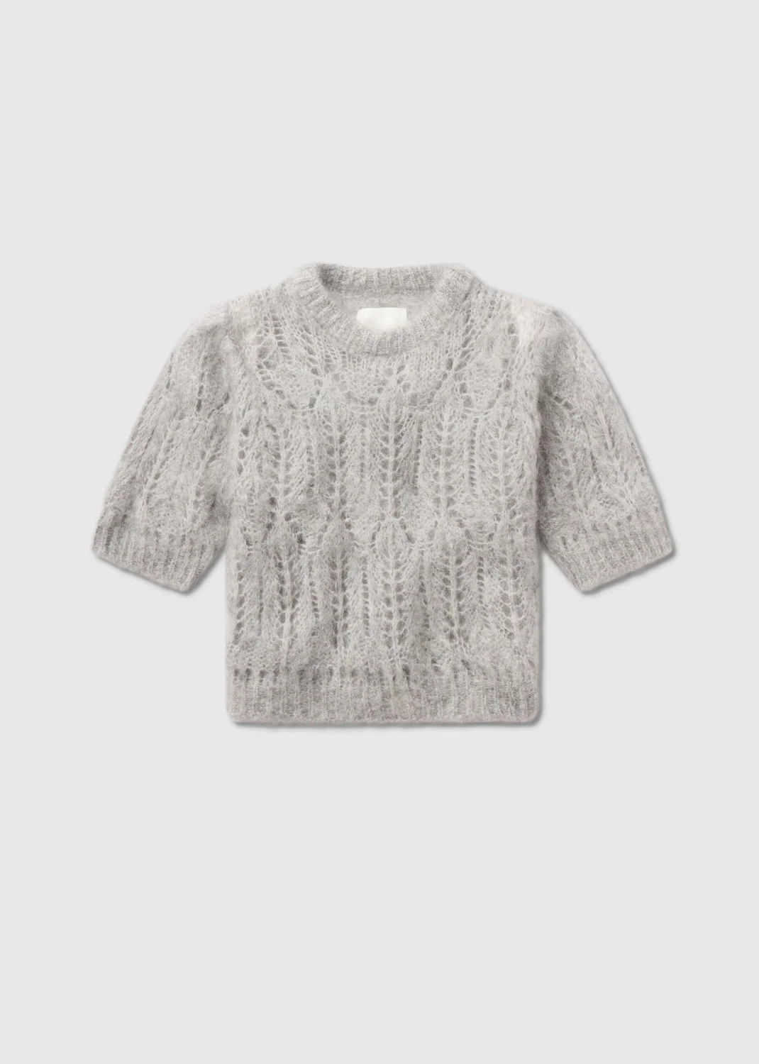 Crafted from an ultra-fine wool, the Odette sweater is designed with a sheer open weave and complete with puffed poplin sleeves. This fit is true to size. Looks Like: Light grey short sleeve knit sweater Feels Like: Wool blend sweater that is soft to the touch DETAILS Chest: 33" Body Length: 18" Sleeve Length: 10 3/4" Model is 5'10" and wearing a size Small Fabric: 37% Alpaca wool 26 % Wool 35% Polyamide 2% Viscose Care Instructions: Dry clean only. Made in Italy with imported materials 5129_HETHR