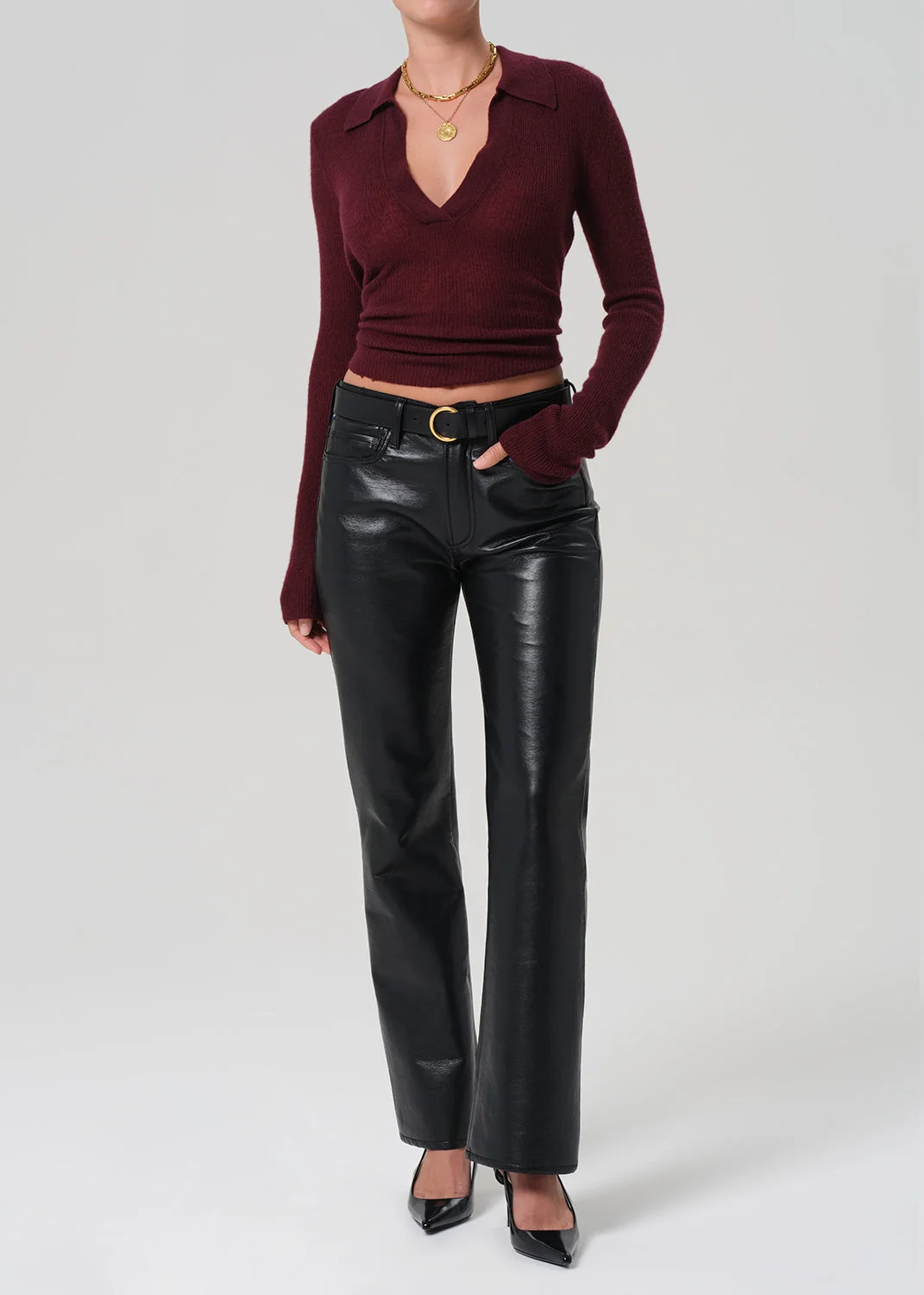 The Simone Polo blends classic detailing with modern softness, thanks to its fine cashmere-wool knit. The clean collar and streamlined shape make it an easy layer from work to weekend. This fit is true to size. Looks Like: Deep dark red with purple undertones long sleeve polo sweater Feels Like: A mix of natural wool fibers and ultra fine cashmere, giving a breathable and soft hand feel DETAILS Body Length: 23 1/2" Sleeve Length: 26" Model is 5'10" and wearing a size Small Fabric Content: 55% Wool 45% Cashmere Care Instructions: Dry clean only. Made in Bulgaria with imported materials 5131_BRG