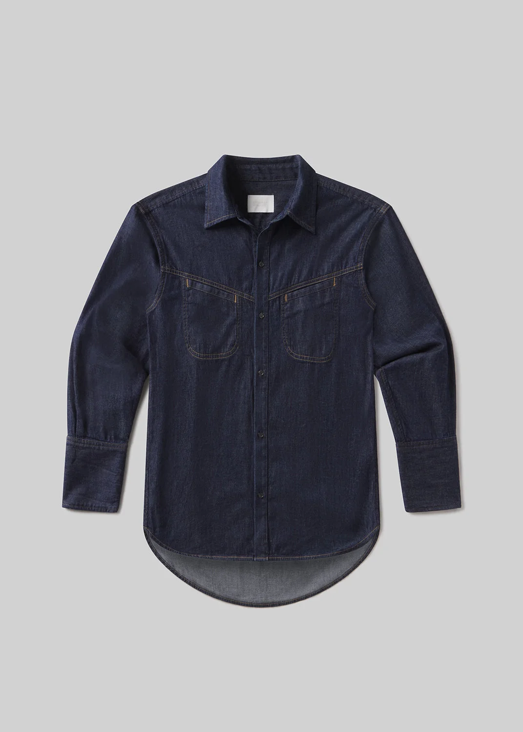 The Solene Shirt is a modern staple, cut in lightweight Japanese denim with a clean, structured drape. Piave's rich indigo tone adds a refined edge—perfect layered over a tank or worn solo with tailored denim. This fit is true to size. Looks Like: Clean dark indigo denim long sleeve shirt Feels Like: Lightweight Japanese denim crafted from breathable, soft cotton with a gentle, natural drape From our HUMANITY Collection DETAILS Body Length: 28 1/4" Sleeve Length: 22 1/2" Model is 5'10" and wearing a size Small Fabric Content: 100% Cotton Care Instructions: Machine wash cold inside out with like colors. Do not bleach. Tumble dry low. Made in USA with imported materials 9422C-1527_PIAVE