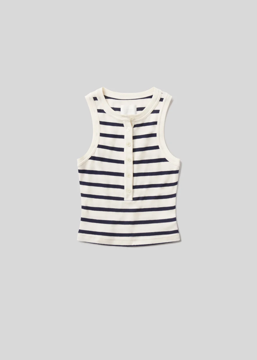 An elevated essential, the Caralyn Tank is crafted from ultra-soft, supportive rib made with regenerative cotton. The sleeveless silhouette features a clean button front and a slim fit that flatters with ease. Perfect layered under shirting or worn solo with denim. This fit is true to size. Looks Like: Cream and navy striped button front sleeveless tank Feels Like: Ultra lightweight rib cotton blend meant to hold its shape all day long From our HUMANITY Collection DETAILS Body Length: 20 1/2" Chest: 28 1/2" Model is 5'10" and wearing a size Small Fabric Content: 90% Cotton 10% Polyester Care Instructions: Machine wash cold inside out with like colors. Do not bleach. Tumble dry low. Made in USA with imported materials 9435-1822_AZRST