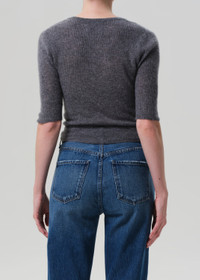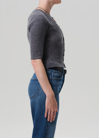 The ‘Tabitha’ is a slim-fitting cardigan knit from a breathable blend of wool and ultra-fine cashmere. Designed with cropped elbow sleeves and a close silhouette, it layers cleanly or wears well on its own—an elevated staple with timeless appeal. This fit is true to size. Looks Like: Dark heathered grey elbow sleeve fitted cardigan Feels Like: A mix of natural wool fibers and ultra fine cashmere, giving a breathable and soft hand feel From our HUMANITY Collection DETAILS Body Length: 20 1/4" Sleeve Length: 12 1/4" Model is 5'10" and is wearing a size Small Fabric Content: 50% Wool 40% Cashmere 10% Solvrone Nobel Care Instructions: Dry clean only. Made in Bulgaria with imported materials 5165_TORRO