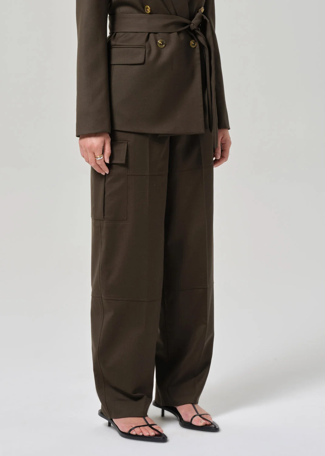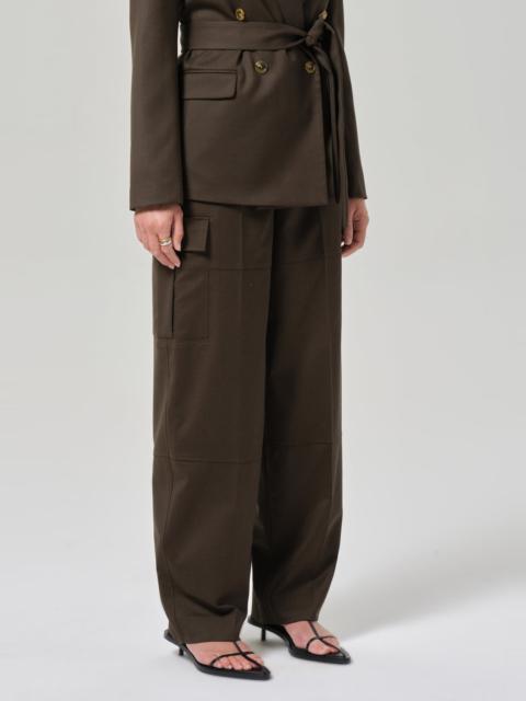Utility refined. The Tailored Cargo Pant fuses the structure of classic suiting with the ease of a modern cargo silhouette. Crafted in seasonless wool, the style drapes effortlessly and features discreet cargo detailing and a tapered fit. This fit is true to size. Argent and Citizens of Humanity reunite for Good Work: Collection Two a capsule that builds on the brands’ shared mission to shape a better future—one that is responsibly crafted and empowers women to look and feel their best. Built on a foundation of sustainable and regenerative materials, Collection Two reimagines tailored denim silhouettes in deep washes; rich seasonal shades of tobacco and cocoa, and a fresh approach to classic suiting, round out the assortment. Designed to move seamlessly from the workplace to life beyond, the capsule reinforces a modern uniform for all facets of life.. DETAILS Closure: Zipper Fly Rise: 13" Inseam: 32 3/4" Leg Opening: 18" Model is 5'10" and wearing a size 2 Fabric: Shell: 98% Virgin Wool 2% Elastane. Lining: 100% Bemberg. Care Instructions: Dry clean only. Made in USA with imported materials HL25-0356_TOBA