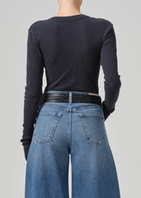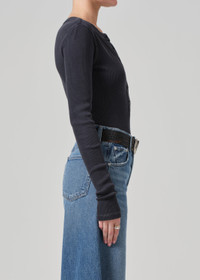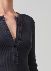 Designed from a form-fitting rib, this versatile henley can be worn fully buttoned or undone for a more relaxed look. This fit is true to size. Looks Like: Dark charcoal grey Feels Like: Ultra-soft, ultra-supportive organic cotton rib with a hint of stretch that holds the body From our HUMANITY Collection DETAILS Body Length: 21 1/2" Sleeve Length: 24 1/2" Model is 5'10" and wearing a size Small Fabric Content: 49% Organic Cotton 49% Tencel Lyocell 2% Spandex Care Instructions: Machine wash cold inside out with like colors. Do not bleach. Tumble dry low. Made in USA with imported materials 9400B-3004_CHMIN