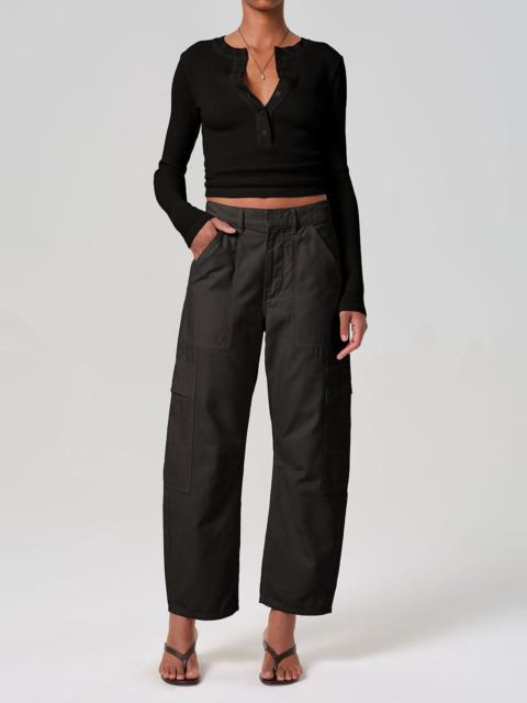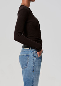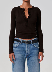 A wardrobe foundation, redefined. This long-sleeve henley is cut from a soft waffle rib that fits close to the body for subtle structure. Designed with a functional button placket, it transitions seamlessly from on-duty to off-hours—buttoned up or perfectly undone. This fit is true to size. Argent and Citizens of Humanity reunite for Good Work: Collection Two a capsule that builds on the brands’ shared mission to shape a better future—one that is responsibly crafted and empowers women to look and feel their best. Built on a foundation of sustainable and regenerative materials, Collection Two reimagines tailored denim silhouettes in deep washes; rich seasonal shades of tobacco and cocoa, and a fresh approach to classic suiting, round out the assortment. Designed to move seamlessly from the workplace to life beyond, the capsule reinforces a modern uniform for all facets of life.. DETAILS Body Length: 22" Sleeve Length: 25" Model is 5'10" and wearing a size Small Fabric Content: 100% Cotton Care Instructions: Machine wash cold inside out with like colors. Do not bleach. Tumble dry low. Made in USA with imported materials 9400B-1785_CHOCO