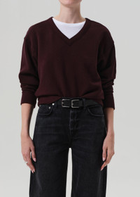 The ‘Vernata’ is a plush fleece pullover with a deep V neckline and relaxed fit. Cut from brushed cotton blend fleece, it offers an ultra-soft, cozy feel—perfect for layering over denim or pairing with easy loungewear. This fit is true to size. Looks Like: Deep dark purple with brown undertones v-neck long sleeve sweater Feels Like: Signature super soft sueded fleece with a smooth and plush hand This product is made with regenerative cotton from Citizens of Humanity Group’s Regenerative Cotton Program. Our program collaborates closely with farmers both domestically and internationally, nurturing growth, fostering education, and encouraging the widespread adoption of regenerative agricultural practices. From our HUMANITY Collection DETAILS Body Length: 23" Chest: 44 1/2" Model is 5'10" and wearing a size Small Fabric Content: 58% Regenerative Cotton 21% Cotton 21% Polyester Care Instructions: Machine wash cold inside out with like colors. Do not bleach. Tumble dry low. Made in USA with imported materials 9459-1445_MGONY
