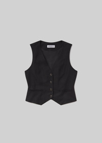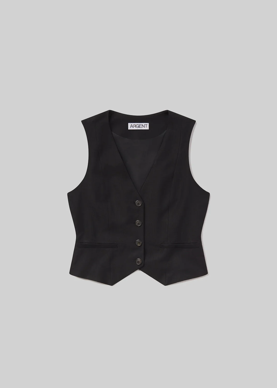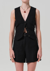 Welcome our timeless waistcoat, now thoughtfully reimagined for the Citizens of Humanity x Argent Good Work collection. Wear it solo or with its matching blazer, and take pride in its responsible construction—featuring European Flax Standard and Lenzing Ecovero certifications that ensure complete traceability, enhanced farming practices, and fibers derived from renewable wood sources. The tailored design includes functional front pockets, a center-front closure featuring recycled buttons, and a fixed back belt that lends an elegant touch. This fit is true to size. The Citizens of Humanity x Argent collection unites two brands driven by a shared commitment to responsible design, sustainability, and empowering women. Crafted for a modern wardrobe that transitions seamlessly from work to life, the collection features elevated, versatile pieces made with sustainable materials such as regenerative cotton and bio indigo dye. More than clothing, this collaboration is a call to action—championing values that matter and inspiring women to advocate for a more sustainable future. DETAILS Measurements: Chest: 36" Body Length: 20 3/4" Fabric: Shell: 72% Viscose 28% Linen Lining: 100% Cupro Care Instructions: Do not wash, do not bleach, cool iron as needed, dry clean only, do not tumble dry. Made in Portugal with imported materials SS25-0207_BLKLN