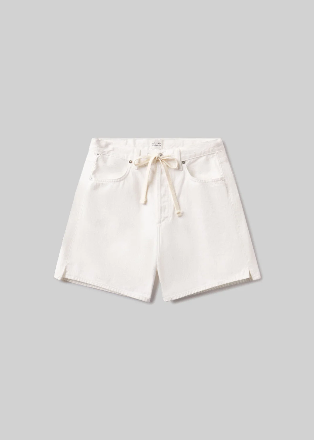 The Brynn Drawstring Short offers a relaxed, easy fit that’s perfect for warm weather and vacation-ready style. Crafted from lightweight white denim, these shorts are ideal for laid-back days. Pair them with tonal linen pieces or a matching tank for a coordinated, effortlessly chic look that takes you from beach to brunch. This fit is true to size. Looks Like: Cloud white clean denim short with drawstring detail Feels Like: Rigid, non-stretch denim with an authentic feel From our HUMANITY Collection DETAILS Closure: Button Fly Rise: 12" Inseam: 6 1/2" Leg Opening: 25" Model is 5'10 and wearing a size 27 Fabric Content: 100% Cotton Care Instructions: Machine wash cold inside out with like colors. Do not bleach. Tumble dry low. Made in USA with imported materials 2135-1248_FRESC