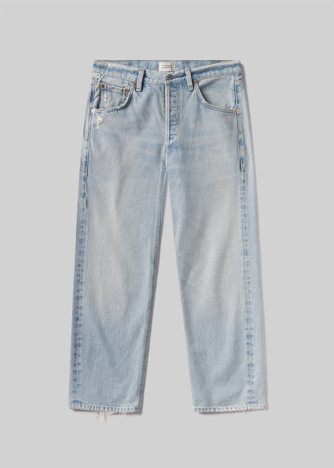 The Winslow channels a relaxed, borrowed-from-the-boys feel with its low rise and easy leg. Crafted from soft yet sturdy rigid denim made from regenerative cotton, it’s finished in a sun-faded indigo that gives a perfectly worn-in look. Pair with a crisp tee or oversized button-down for effortless balance.. This fit is true to size. Looks Like: Light indigo denim pant Feels Like: Rigid, non-stretch cotton denim with a soft hand for all day wearability This product is made with regenerative cotton from Citizens of Humanity Group’s Regenerative Cotton Program. Our program collaborates closely with farmers both domestically and internationally, nurturing growth, fostering education, and encouraging the widespread adoption of regenerative agricultural practices. From our HUMANITY Collection DETAILS Closure: Button Fly Rise: 11 1/4" Inseam: 26" Leg Opening: 15 1/2" Model is 5'10" and wearing a size 27 Fabric Content: 100% Regenerative Cotton Care Instructions: Machine wash cold inside out with like colors. Do not bleach. Tumble dry low. Made in Turkey with imported materials 2182-3041_BLARE