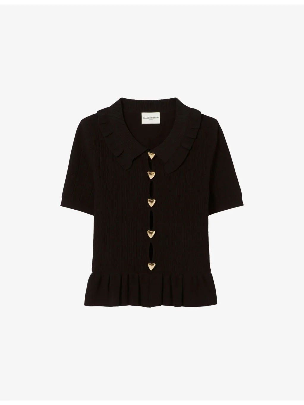 PRODUCT DETAILS - Claudie Pierlot stretch-knit top - 57% viscose, 25% polyester 15% polyamide, 3% elastane - Exposed button fastening at front - Slim fit, collared, button-down detail, short sleeves, heart embellished buttons, frill hem - Hand wash - True to size - Midweight, slight stretch Ref: R04618333