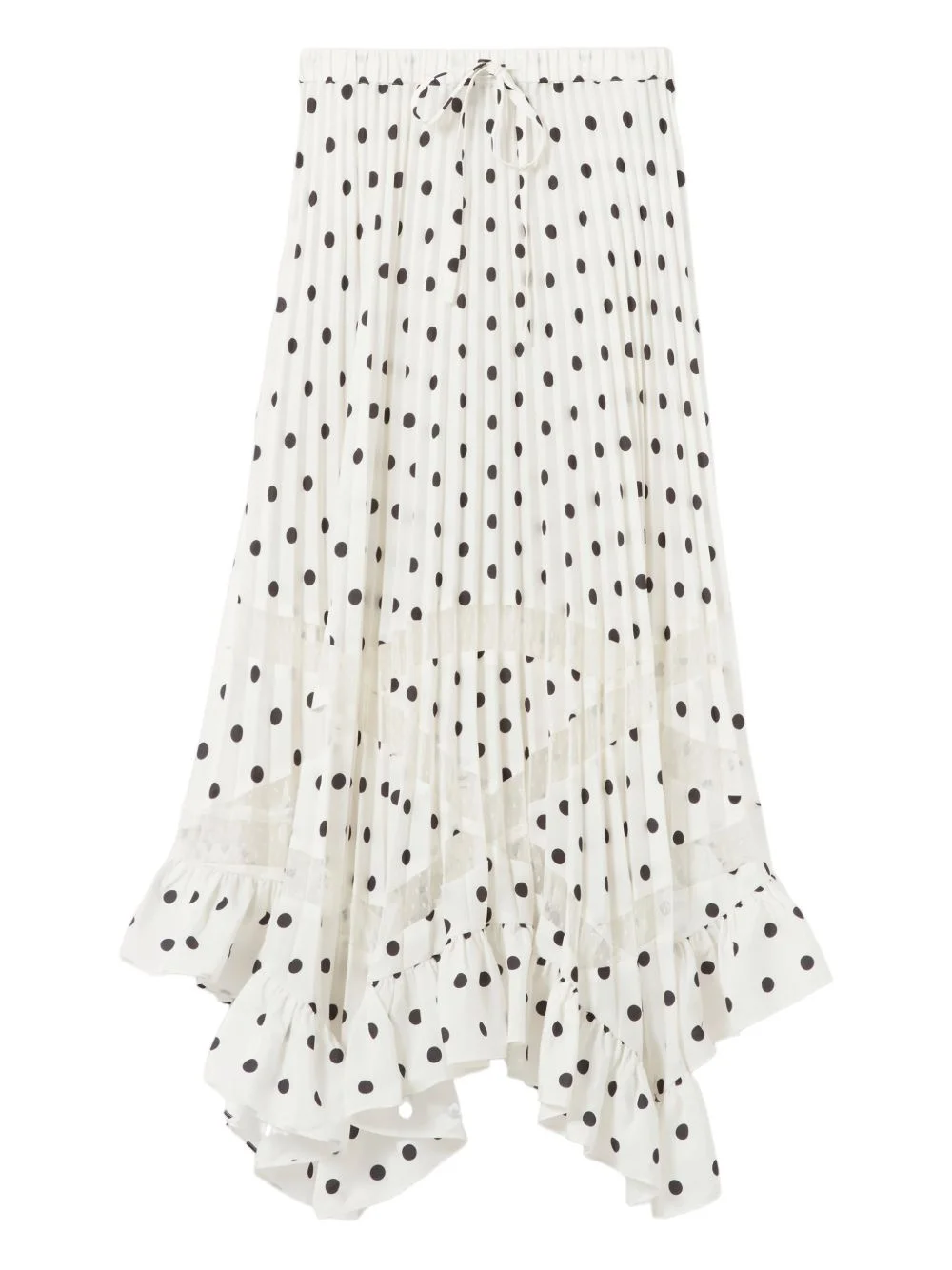 polka-dot lace band midi skirt Highlights - White and black - Polka-dot pattern - Lace band - Pleated - Ruffled hem - Drawstring fastening Imported Composition Polyester 100% Washing instructions Read Manufacturer Guidelines