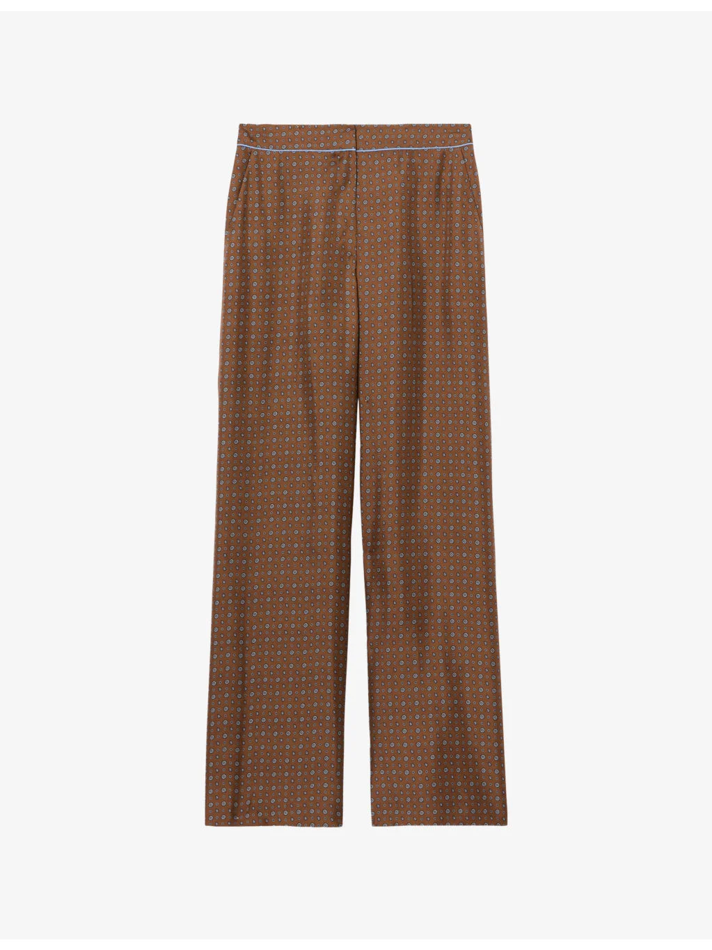 PRODUCT DETAILS - Claudie Pierlot woven trousers - 100% polyester - Button, hook-and-eye and zip-fly fastening - Regular fit, mid-rise, contrast piping, two pockets at the side, wide leg, all-over graphic print - Dry clean - True to size - Model is 5ft 9in/1.76m and wears a size UK 8 - Lightweight, non-stretch Ref: R04532206