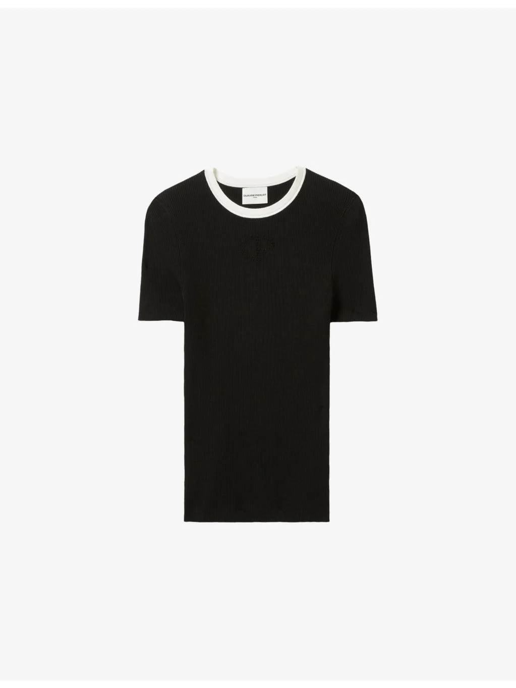 PRODUCT DETAILS - Claudie Pierlot knitted T-shirt - 71% viscose, 29% polyester - Regular fit, round-neck, short sleeves, contrast trim, subtle brand embossment to chest - Hand wash - True to size - Lightweight, slight stretch Ref: R04508832