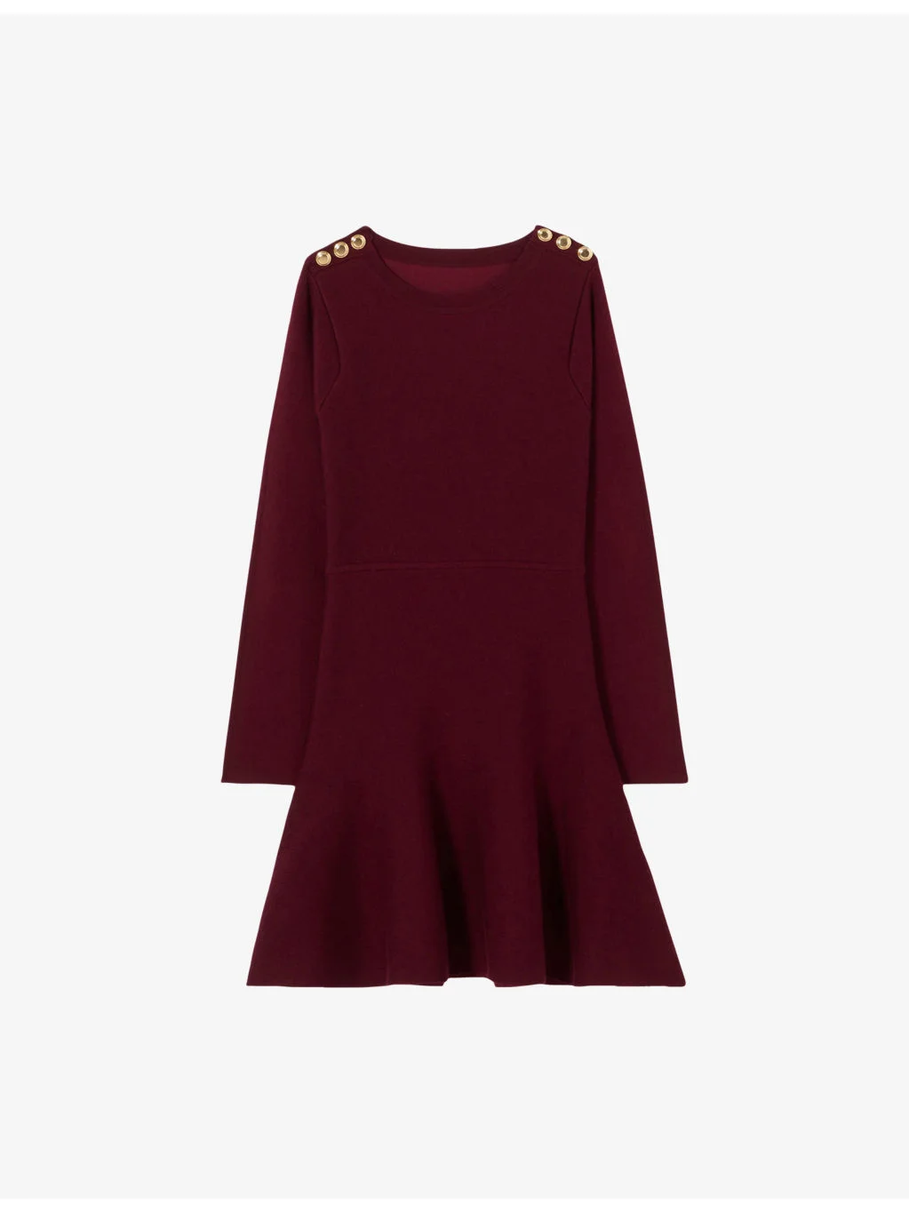PRODUCT DETAILS - Claudie Pierlot knitted dress - 34% viscose, 29% polyamide, 19% acrylic, 18% wool - Exposed button fastening at front - Slim fit, round neck, gold-tone buttons at the shoulder, fitted waist, flared skirt - Hand wash - True to size - Model is 5ft 9in/1.75m and wears a size UK 8 - Midweight, slight stretch Ref: R04508840
