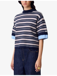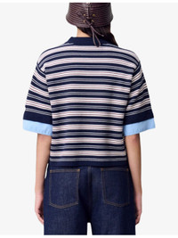 PRODUCT DETAILS - Claudie Pierlot knitted top - 42% acrylic, 42% wool, 16% polyamide; cuff 100% cotton; rib 51% acrylic, 49% wool - Relaxed fit, round neck, short sleeves, dropped shoulders, all-over striped, contrasting poplin trim at cuffs, brand applique at one sleeve, all-over knitted, ribbed-knit trim to collar and cuffs - Hand wash - True to size - Midweight, non-stretch Ref: R04508862