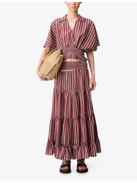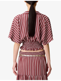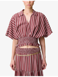 PRODUCT DETAILS - Claudie Pierlot woven shirt - 84% modal, 16% polyamide - Relaxed fit, collared, V-neck, short sleeves, all-over stripe print, shirred waist - Machine wash at 30°C - True to size - Lightweight, non-stretch Ref: R04599331